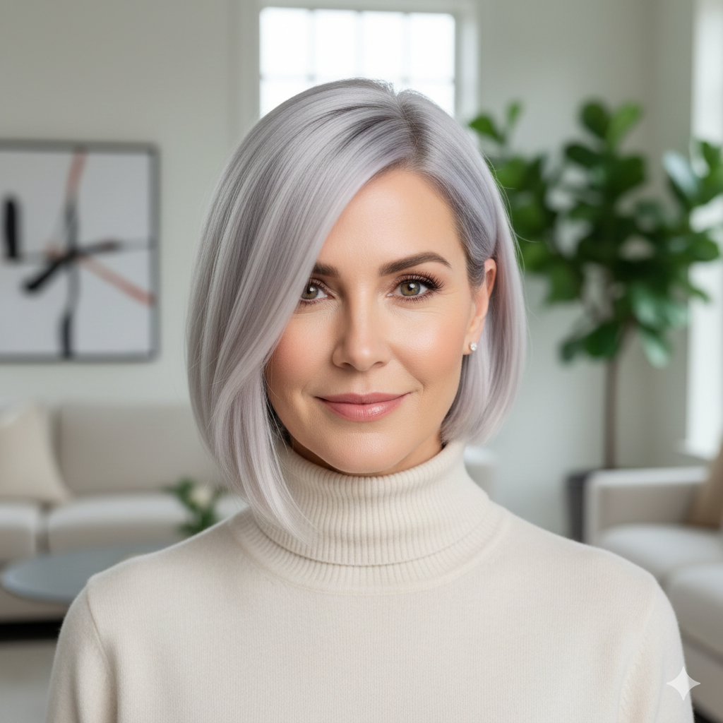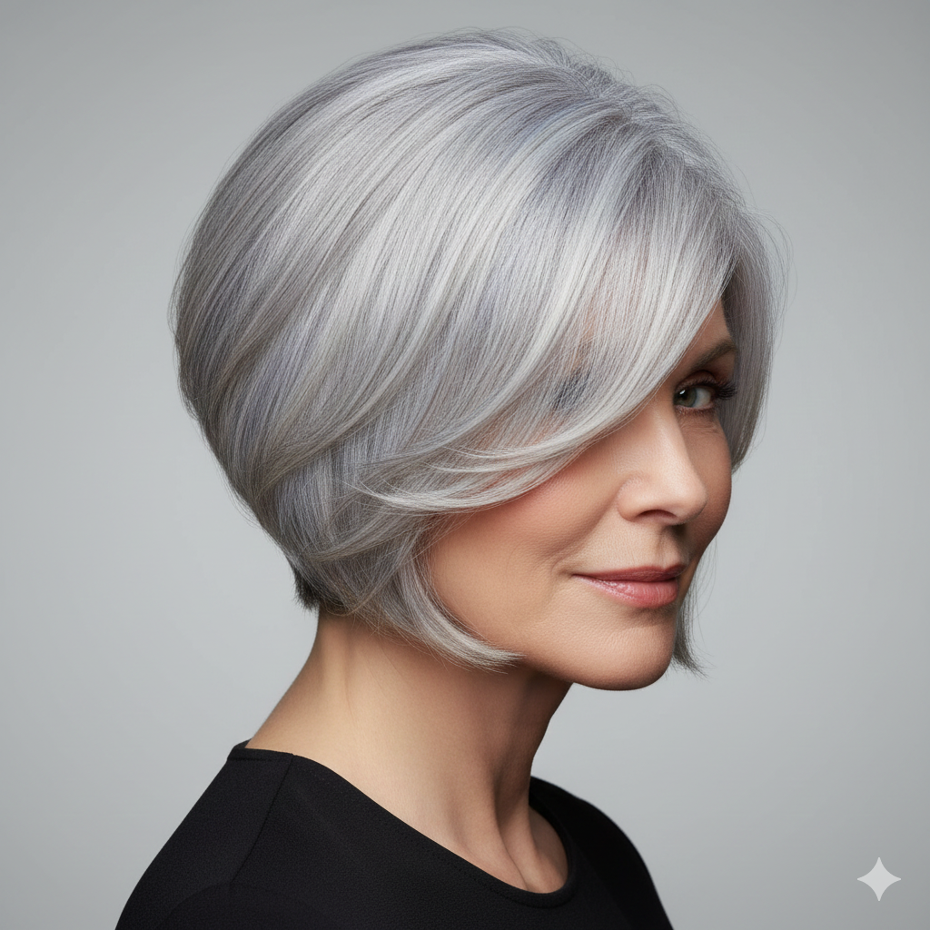 We zien hier een Gladde Asymmetrische Bob waarbij één kant van het haar duidelijk langer is dan de andere. Deze moderne snit is ideaal voor oudere dames die een statement willen maken en hun jeugdige flair willen benadrukken, terwijl de strakke, gladde afwerking zorgt voor klasse. De asymmetrie leidt de aandacht af van de kaaklijn en past daardoor perfect bij vierkante of ronde gezichtsvormen.