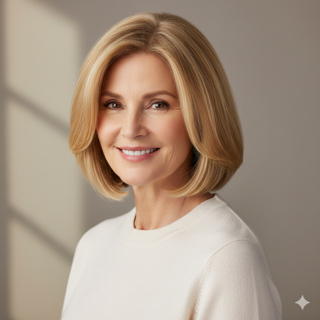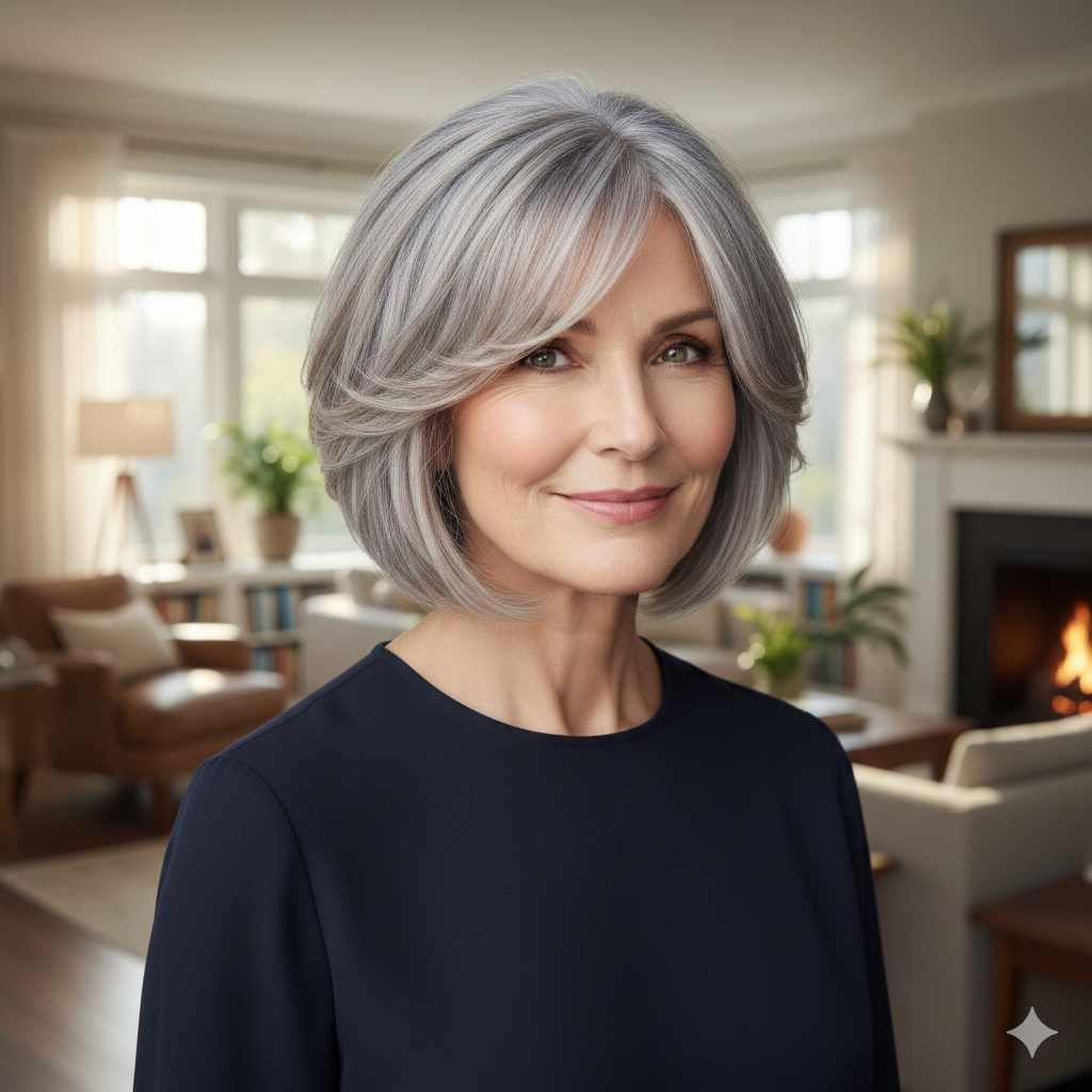 Dit is een Choppy Bob (ongelijke, getextureerde bob), gekenmerkt door subtiele, onregelmatige lagen die zorgen voor een warrige, casual look. Dit type bob is geweldig voor oudere dames omdat het weinig onderhoud vereist en de zachte, “losse” textuur de gelaatstrekken verzacht en een frisse uitstraling geeft. Het is het meest flatteus voor dames met fijn tot middeldik haar dat wat extra textuur en beweging nodig heeft.