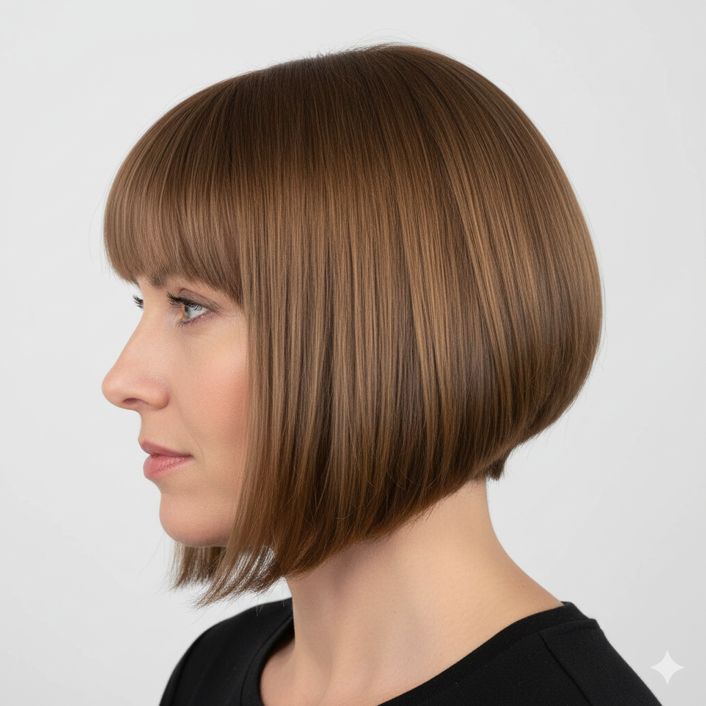 Dit betreft een Omgekeerde (Graduated) Bob, waarbij de achterkant korter en gestapeld is en de voorkant langer, zonder de duidelijke hoek van de A-lijn. De gradatie in de nek zorgt voor geweldig volume en een strakke, dynamische profiellijn. Dit is een elegante, moderne keuze voor oudere dames met normaal tot dik haar. Het creëert een mooie lijn voor een ronde of hartvormige gezichtsvorm.