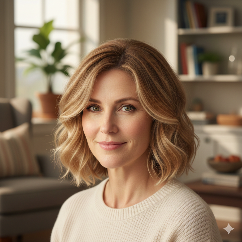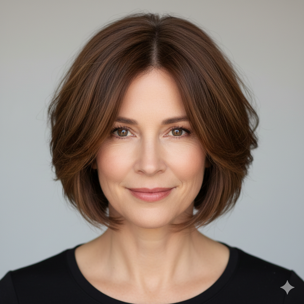Dit is een Choppy Bob (ongelijke, getextureerde bob), gekenmerkt door subtiele, onregelmatige lagen die zorgen voor een warrige, casual look. Dit type bob is geweldig voor oudere dames omdat het weinig onderhoud vereist en de zachte, “losse” textuur de gelaatstrekken verzacht en een frisse uitstraling geeft. Het is het meest flatteus voor dames met fijn tot middeldik haar dat wat extra textuur en beweging nodig heeft.