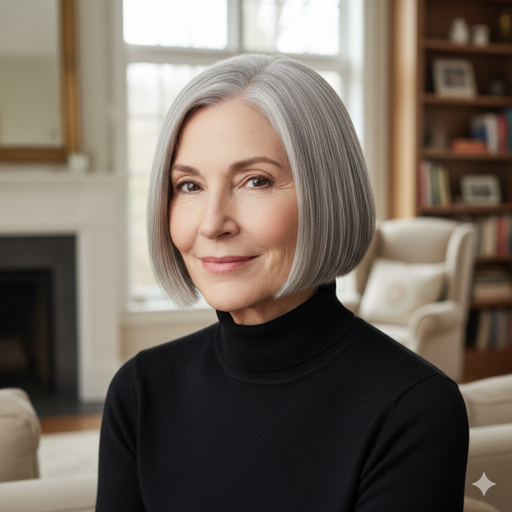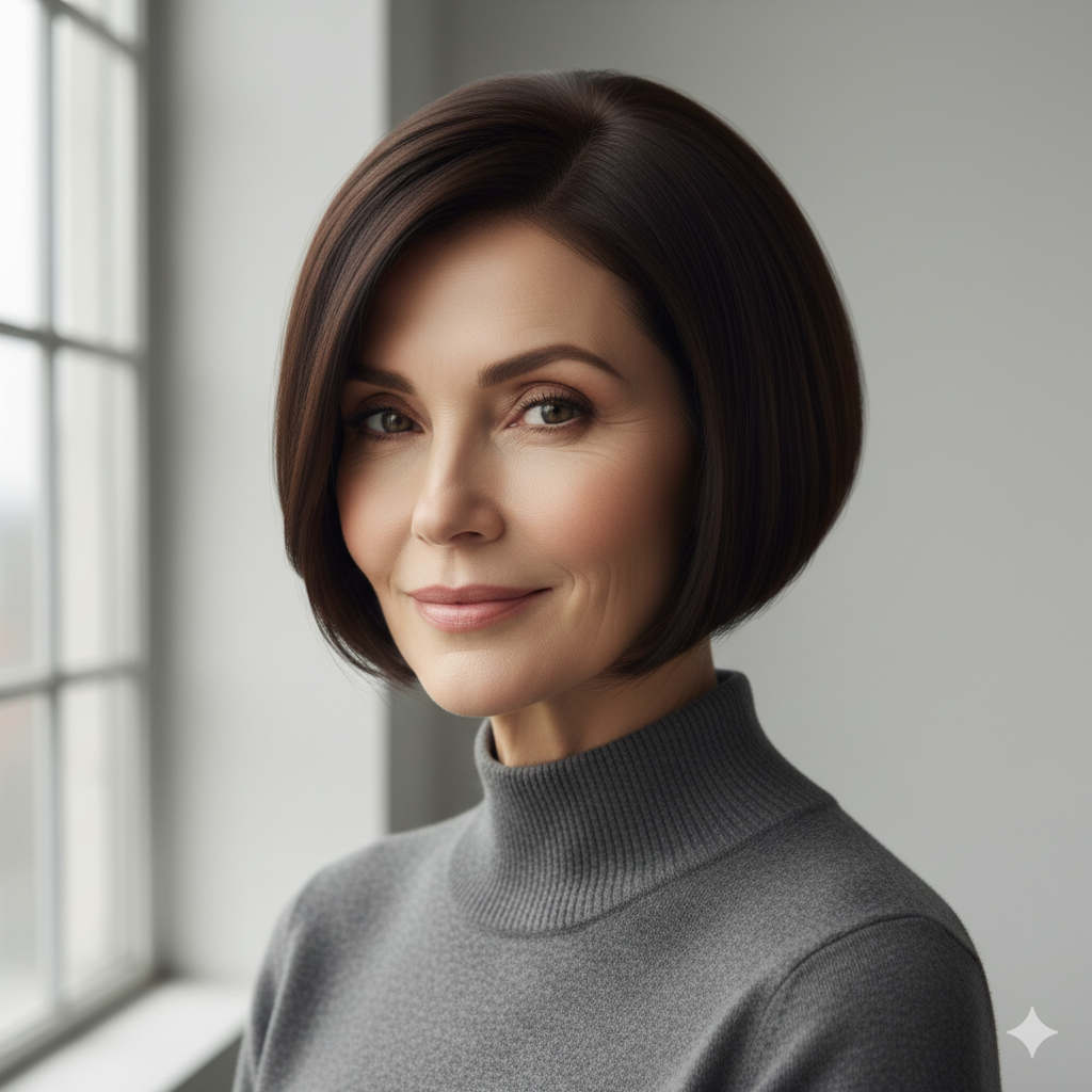 Dit is een Klassieke Kinlange Bob met een strakke, rechte lijn. Dit tijdloze kapsel is uitermate geschikt voor oudere dames omdat het de kaaklijn accentueert en een verzorgde, elegante uitstraling geeft zonder te veel onderhoud te vereisen. Het staat het mooist bij vrouwen met een ovalen of langwerpige gezichtsvorm en bij dikker, steil haar, omdat de snit dan zijn volle, strakke vorm behoudt.