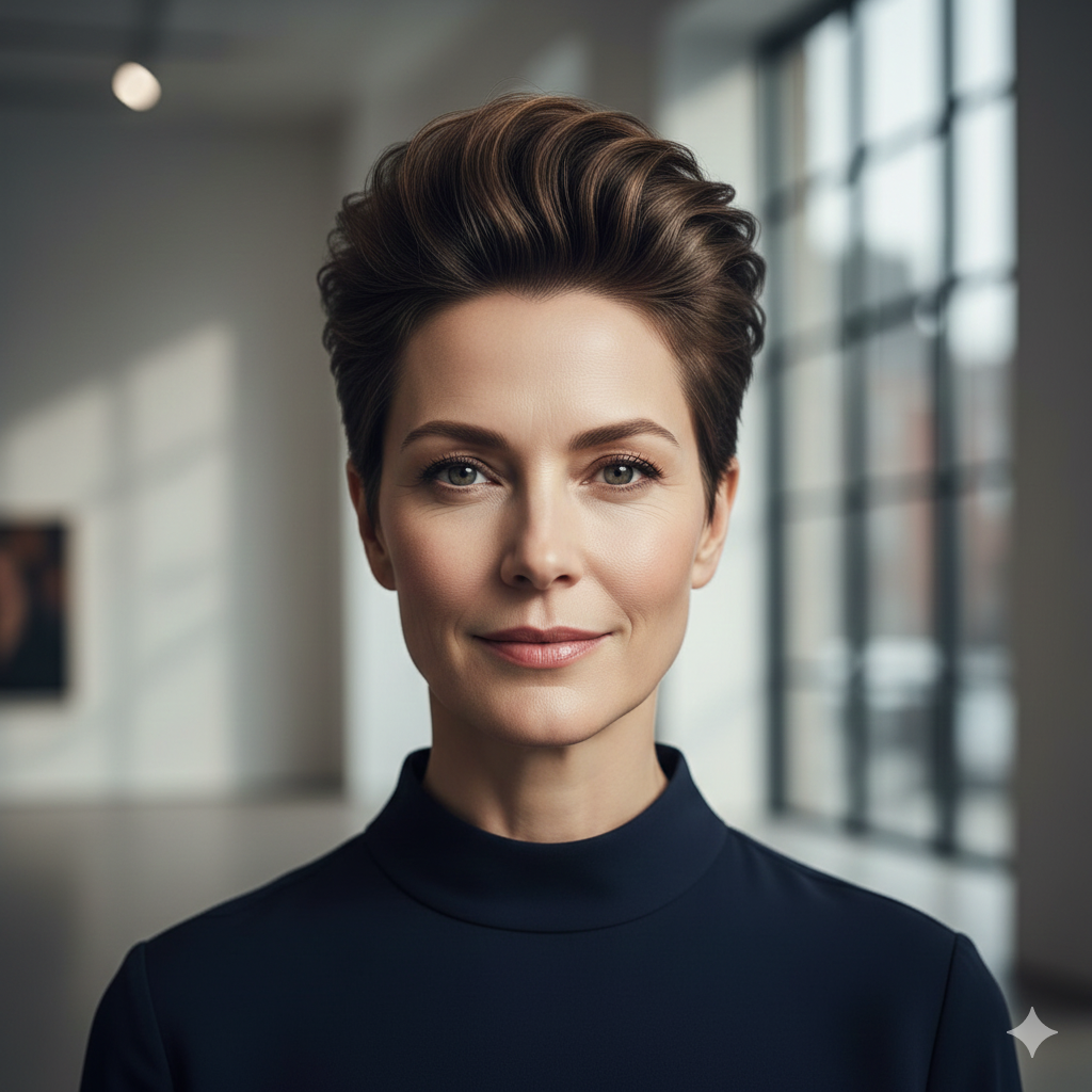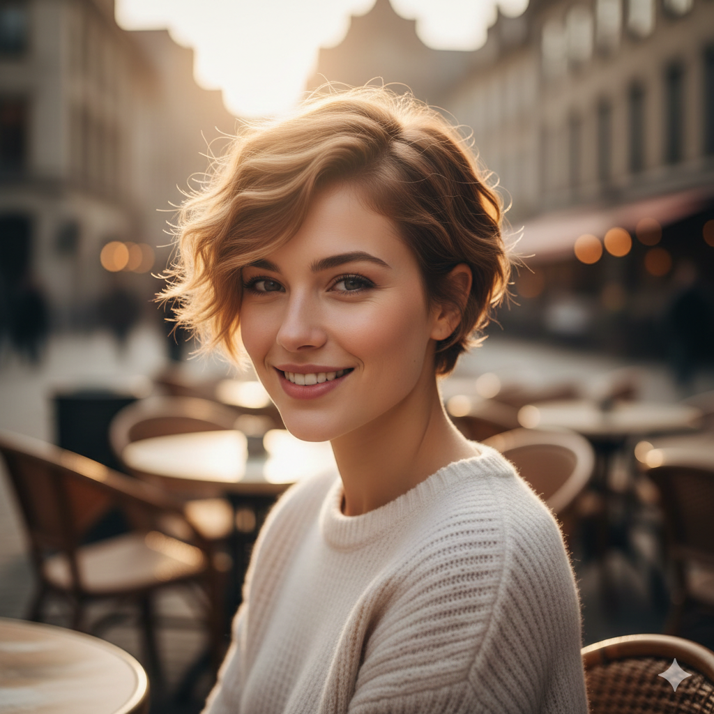 Een vrouw met een zeer kort, getrimd kapsel, iets langer dan een pixie, met zachte, gevederde uiteinden die beweging en lichtheid geven.