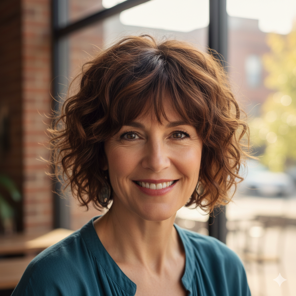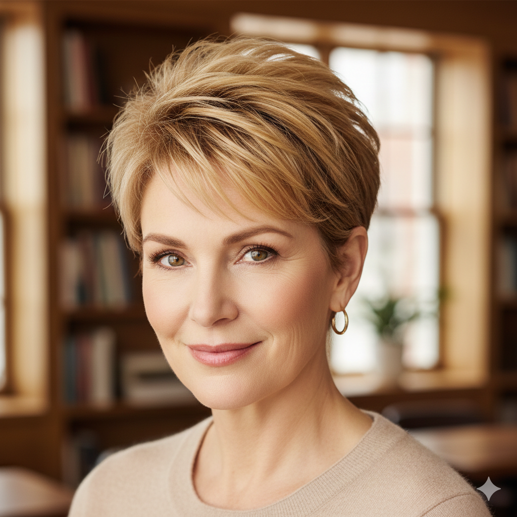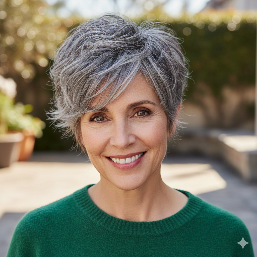 Een vrouw met een levendige, gelaagde pixie die kort is in de nek en langer aan de bovenkant. Het kapsel heeft veel textuur en een ‘messy chic’ effect, perfect voor dunner wordend haar.