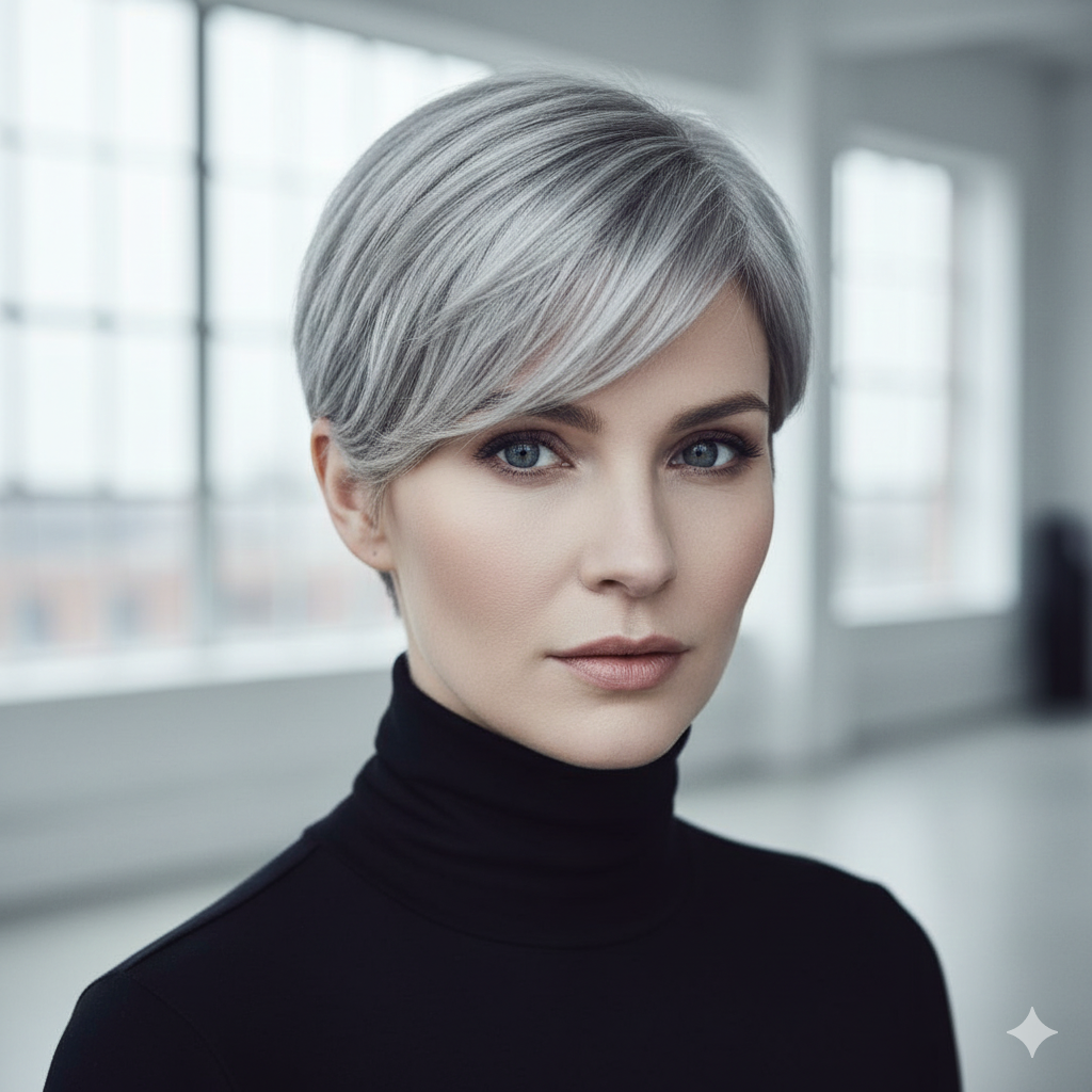 Een ultrakorte snit in een prachtige zilver- of grijstint, met subtiel donkere aanzetten voor diepte en een moderne touch.