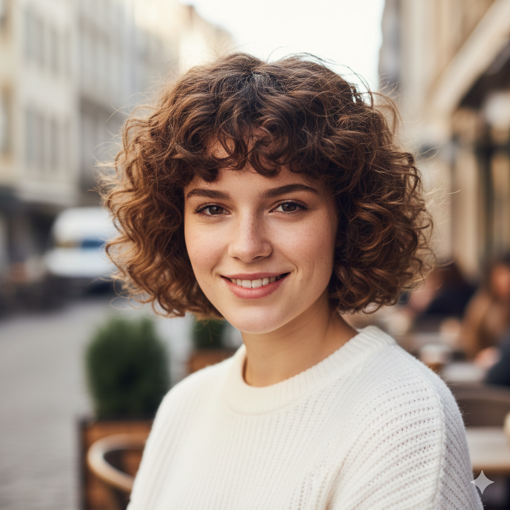 Een vrouw met een moderne, extreem gelaagde korte shag die perfect is om natuurlijke krullen of slag te accentueren. Het is een speels en onderhoudsarm kapsel.