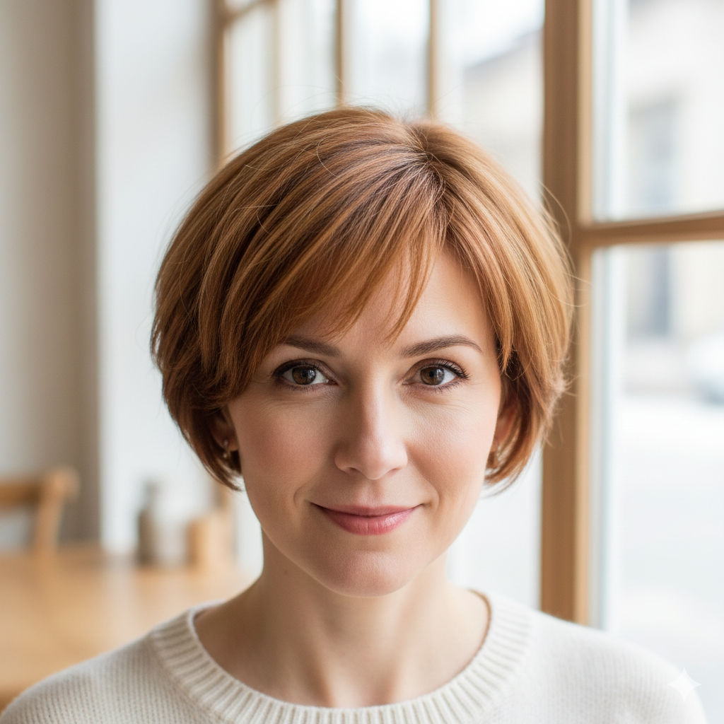 Een vrouw met een klassieke, korte snit. De bovenste lagen zijn gestyled in zachte, subtiele pieken met een verfijnde, pittige finish.