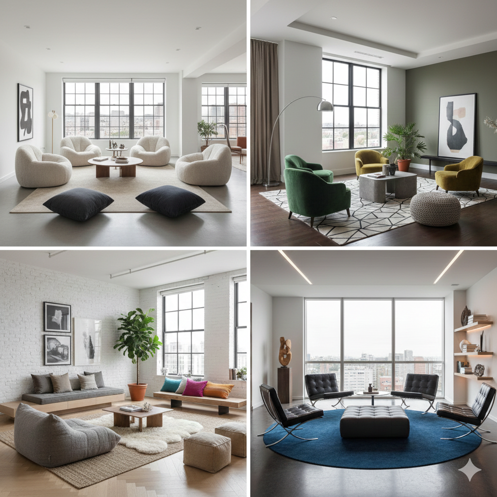 - Gezelligheid en conversatie: Gek genoeg kan het weghalen van de bank de sfeer intiemer maken. Met losse fauteuils of stoelen die je rond een salontafel groepeert, ontstaat een gezellige kring die uitnodigt tot gesprek[9]. Iedereen zit naar elkaar gericht in plaats van op een rij naast elkaar. Zo bevorder je interactie – ideaal voor als er vrienden op bezoek komen. Een cirkel van comfortabele stoelen met kussentjes en een poef in het midden kan net zo uitnodigend zijn als een traditionele zithoek.